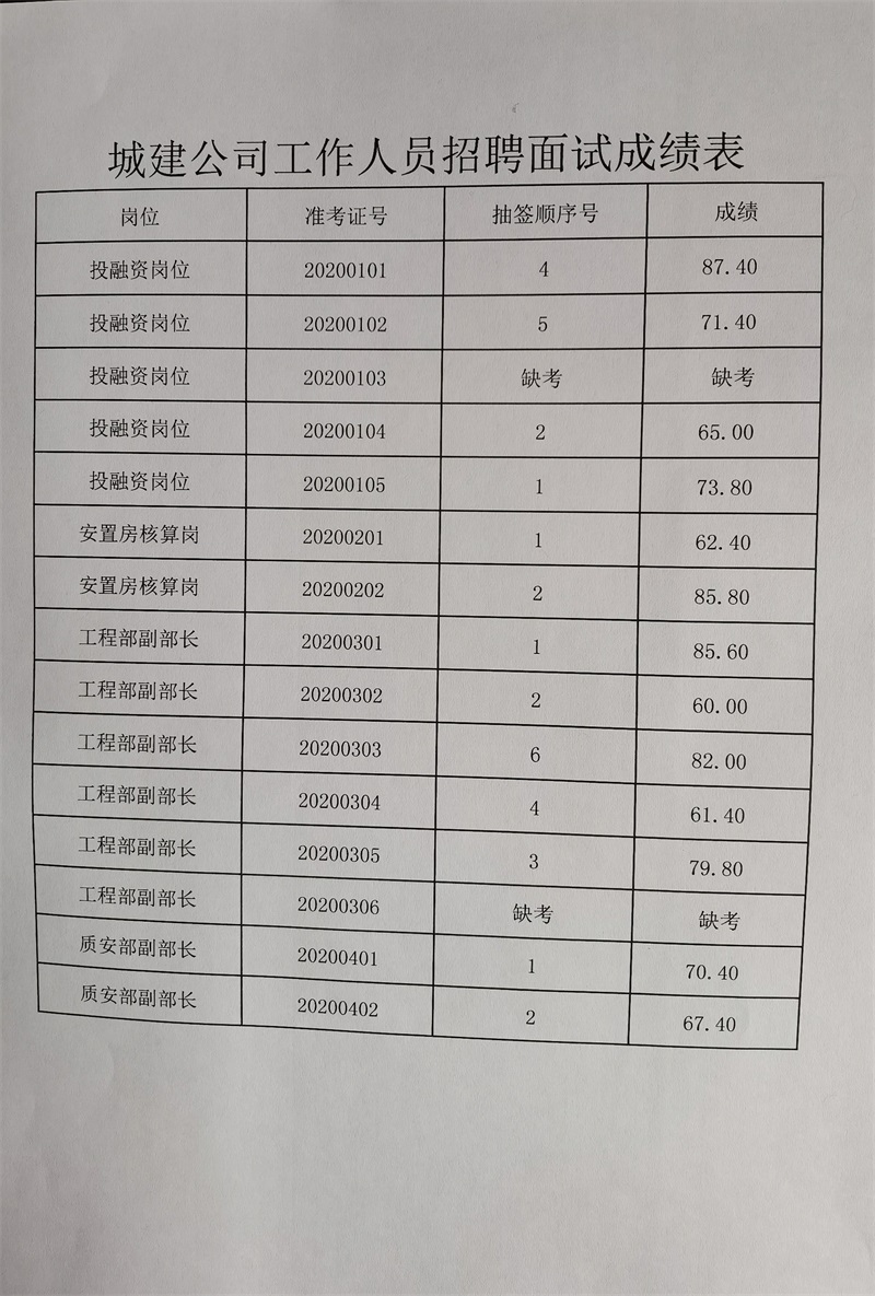 宜昌市點(diǎn)軍城鄉(xiāng)建設(shè)開發(fā)有限公司2020年公開招聘工作人員面試于2020年12月12日結(jié)束,現(xiàn)將面試成績公示如下,如有疑問請于工作日撥打公司電話咨詢。電話為0717-6622026,公示期5天。