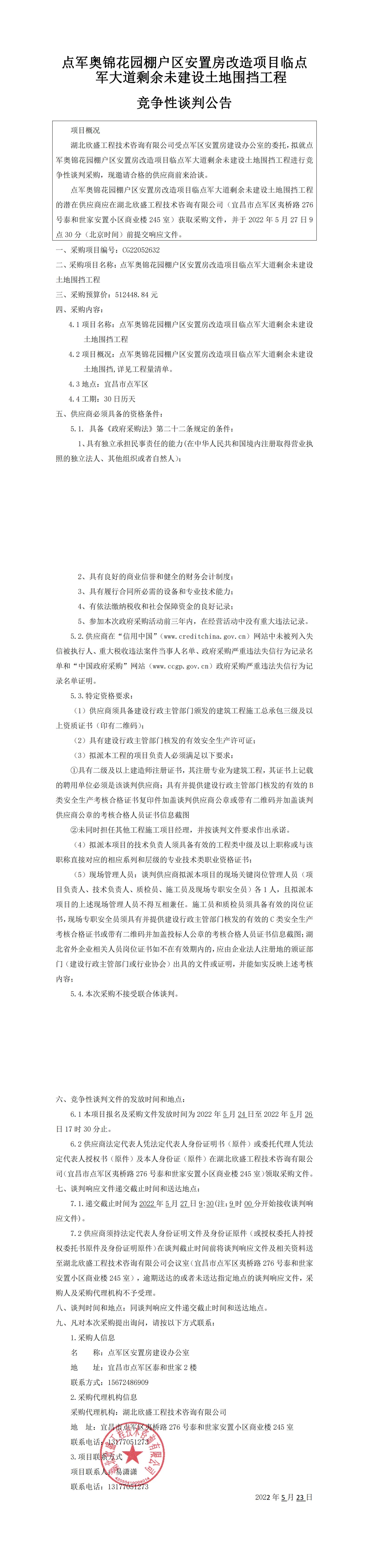 點(diǎn)軍奧錦花園棚戶(hù)區(qū)安置房改造項(xiàng)目臨點(diǎn)軍大道剩余未建設(shè)土地圍擋工程競(jìng)爭(zhēng)性談判公告