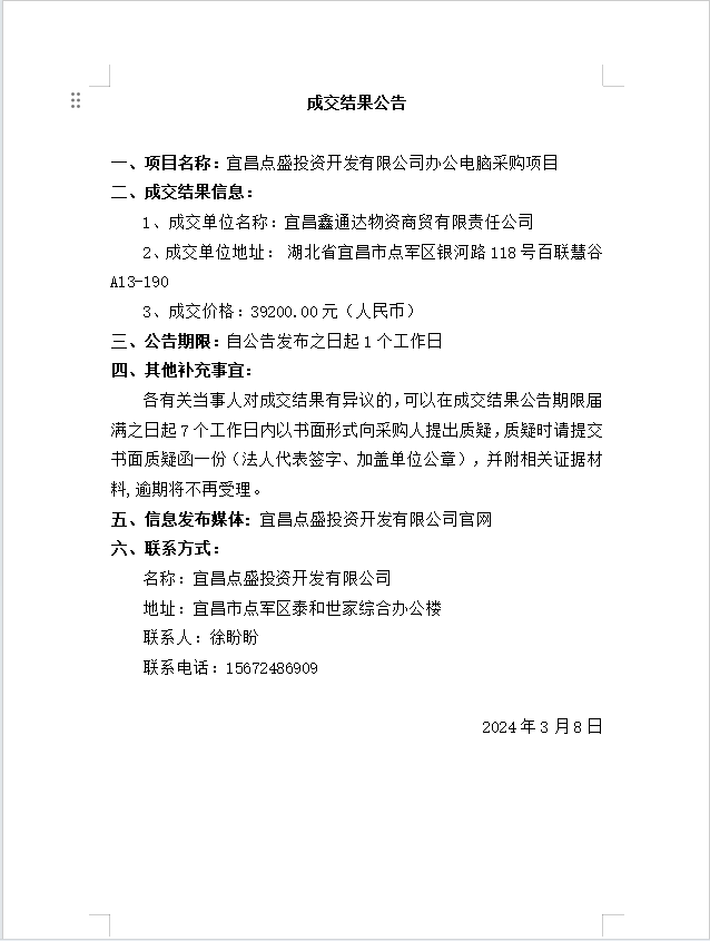 宜昌點盛投資開發(fā)有限公司辦公電腦采購項目成交公告