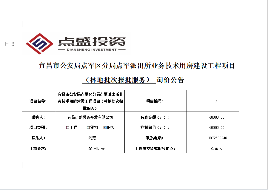 宜昌市公安局點(diǎn)軍區(qū)分局點(diǎn)軍派出所業(yè)務(wù)技術(shù)用房建設(shè)工程項(xiàng)目 (林地批次報(bào)批服務(wù)) 詢價(jià)公告