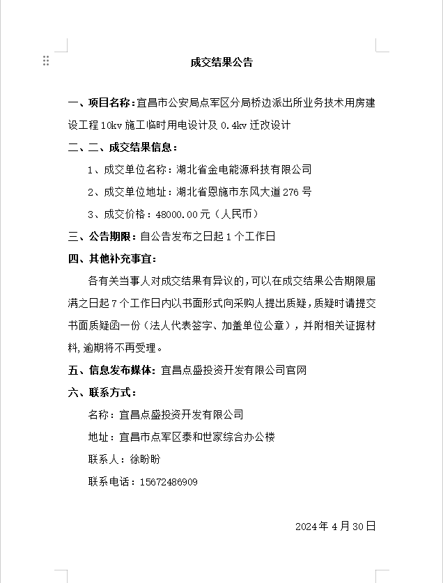 宜昌市公安局點(diǎn)軍區(qū)分局橋邊派出所業(yè)務(wù)技術(shù)用房建設(shè)工程10kv施工臨時(shí)用電設(shè)計(jì)及0.4kv遷改設(shè)計(jì)成交公告