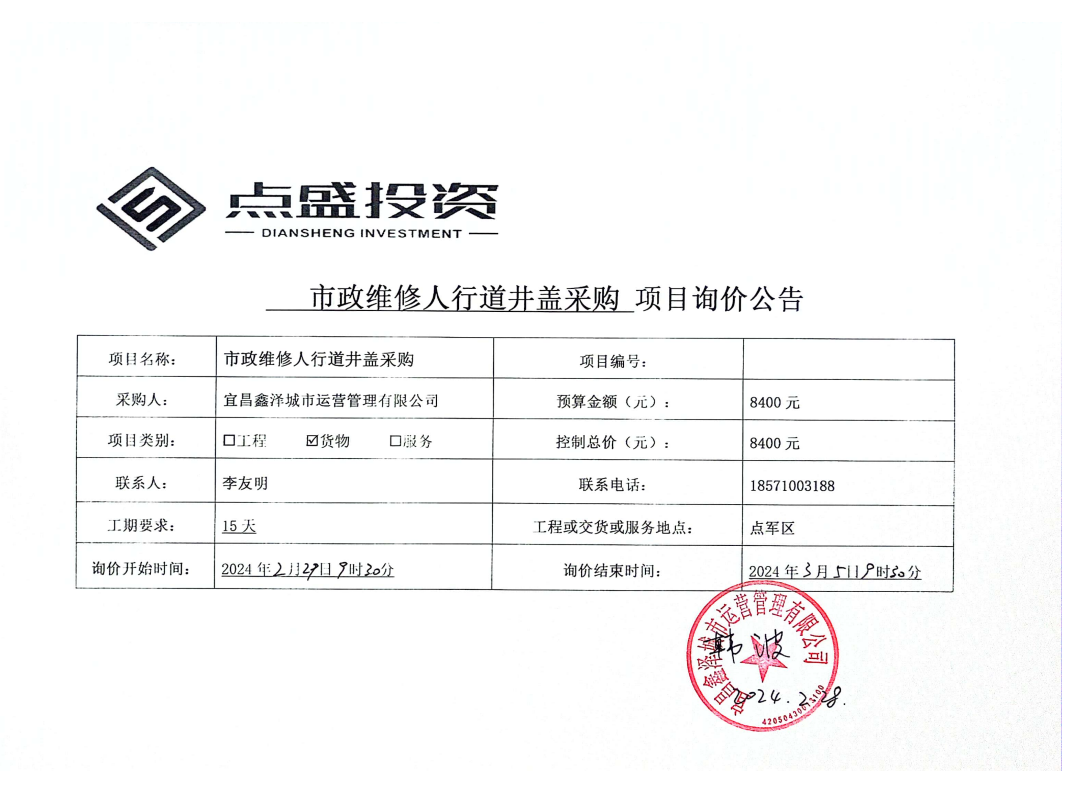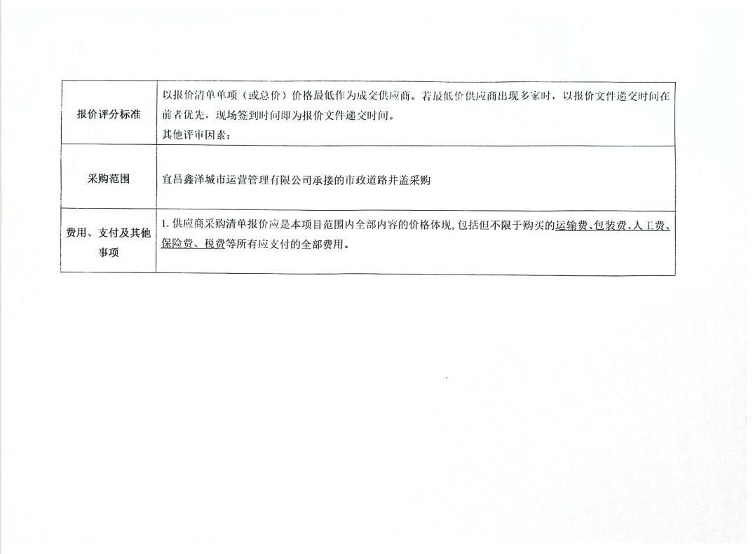 宜昌鑫澤城市運(yùn)營(yíng)管理有限公司市政維修人行道井蓋采購(gòu)項(xiàng)目詢價(jià)公告