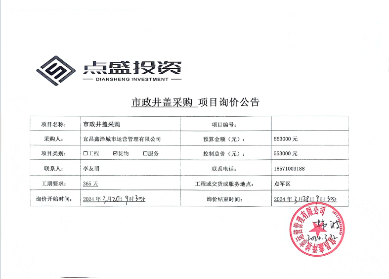 宜昌鑫澤城市運(yùn)營(yíng)管理有限公司市政井蓋采購(gòu)項(xiàng)目詢價(jià)公告