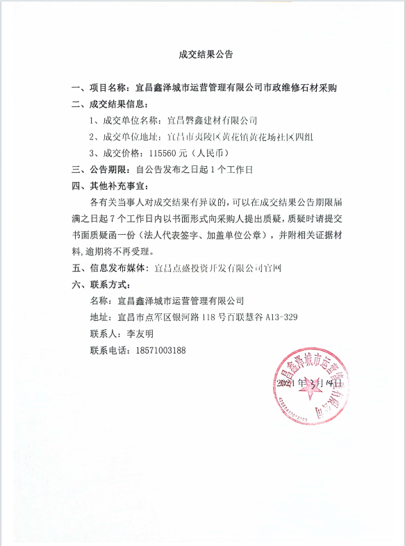 宜昌鑫澤城市運(yùn)營(yíng)管理有限公司市政維修石材采購(gòu)項(xiàng)目成交公告