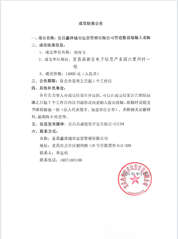 管道敷設混凝土采購項目成交公告