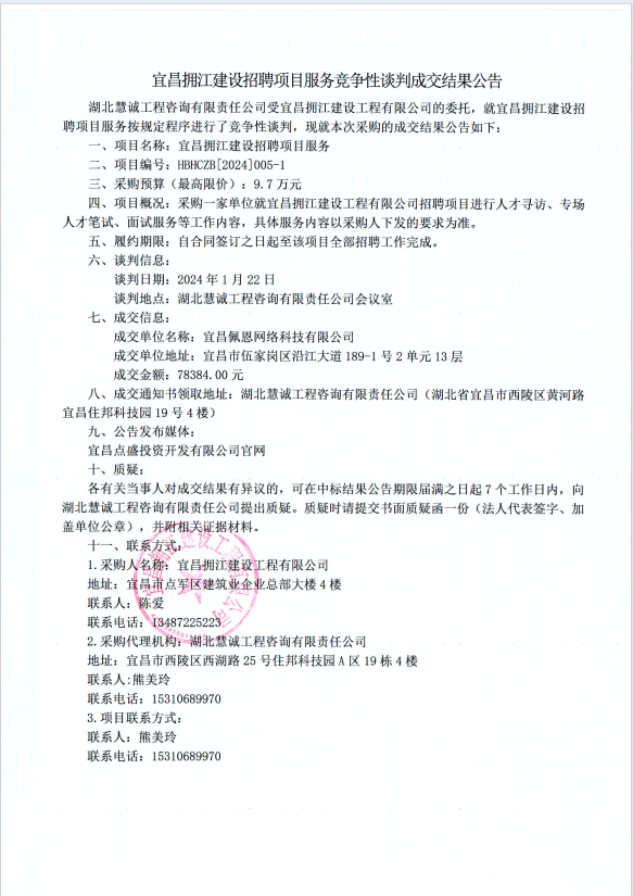 宜昌擁江建設(shè)招聘項(xiàng)目服務(wù)競(jìng)爭(zhēng)性談判成交結(jié)果公告