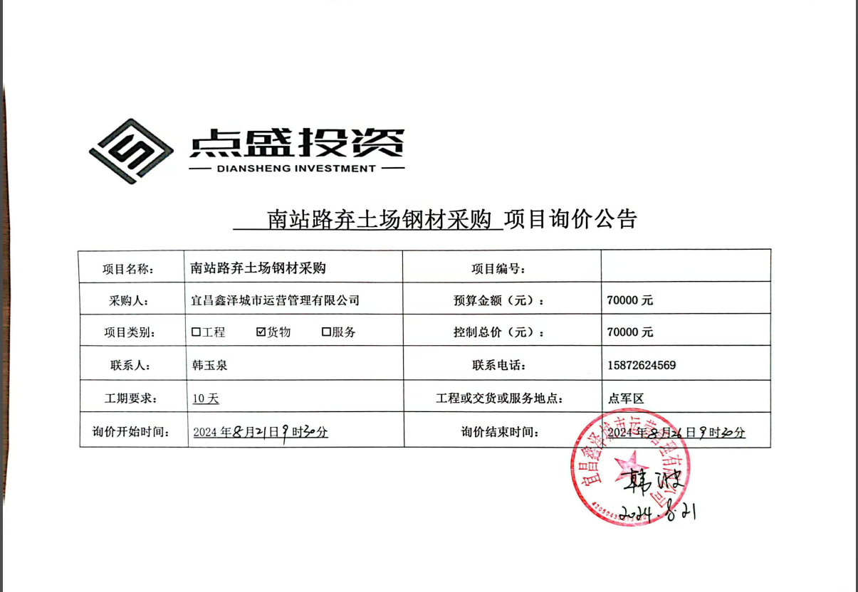 南站路棄土場鋼材采購項(xiàng)目詢價(jià)公告