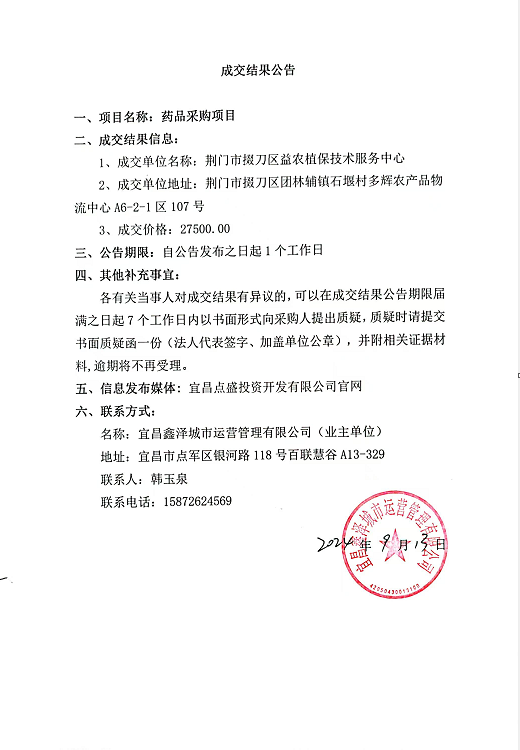 宜昌鑫澤城市運(yùn)營(yíng)管理有限公司藥品采購項(xiàng)目成交公告