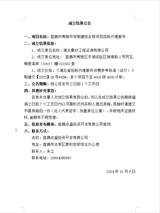宜昌市夷陵中學(xué)新建綜合樓項(xiàng)目招標(biāo)代理服務(wù)成交公告