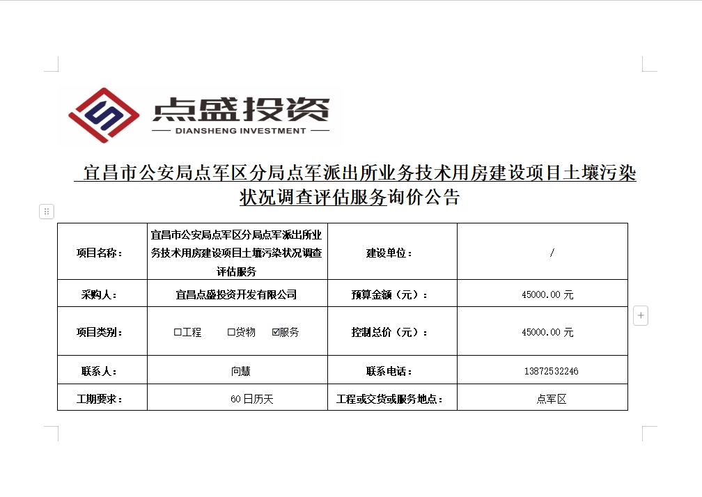 宜昌市公安局點(diǎn)軍區(qū)分局點(diǎn)軍派出所業(yè)務(wù)技術(shù)用房建設(shè)項(xiàng)目土壤污染狀況調(diào)查評(píng)估服務(wù)詢價(jià)公告