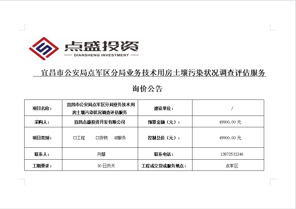 宜昌市公安局點軍區(qū)分局業(yè)務(wù)技術(shù)用房土壤污染狀況調(diào)查評估服務(wù)詢價公告