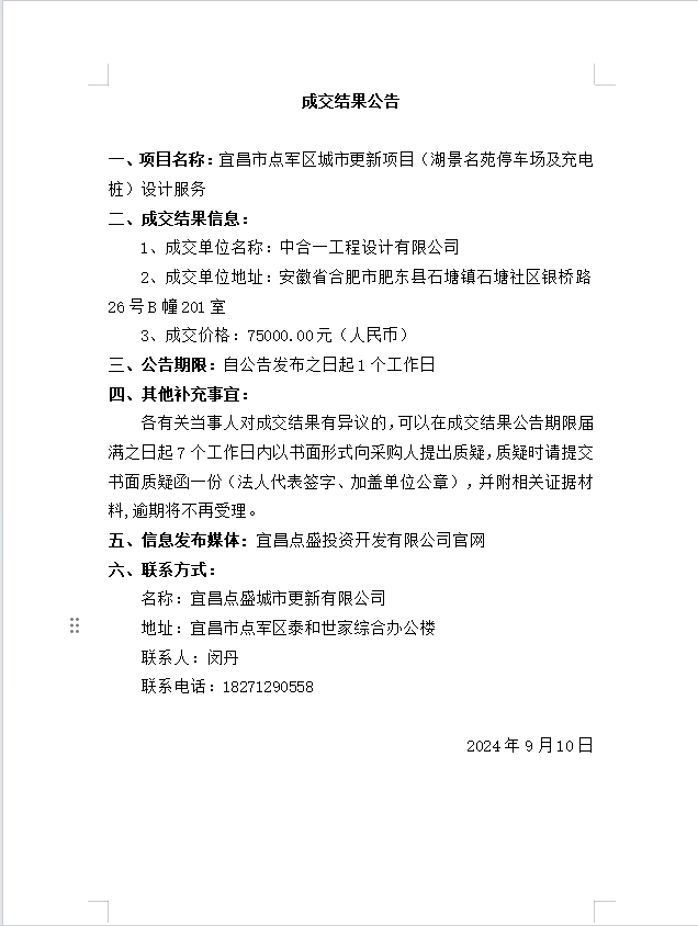 宜昌市點(diǎn)軍區(qū)城市更新項(xiàng)目(湖景名苑停車場(chǎng)及充電樁)設(shè)計(jì)服務(wù)成交公告