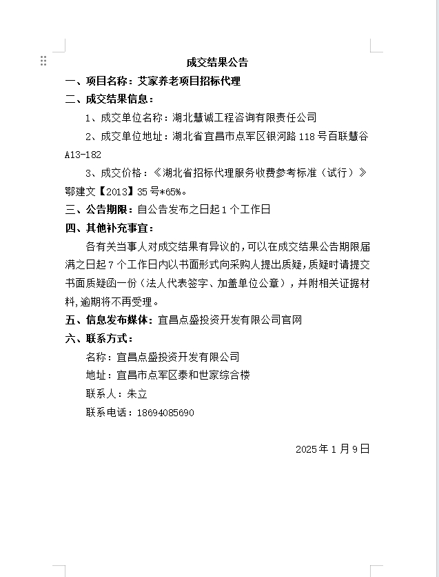艾家養(yǎng)老項(xiàng)目招標(biāo)代理成交公告