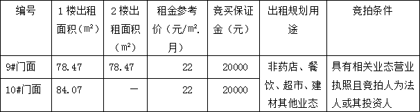 上述第9號(hào)門面房整體出租1至2樓,10#門面房只出租一樓。目前,上述門面房均處于空置的毛坯狀態(tài),現(xiàn)狀分別對(duì)外出租。相關(guān)競(jìng)買事項(xiàng)詳見本公司拍賣資料中的《競(jìng)買協(xié)議》樣本特別說明條款內(nèi)容,且標(biāo)的物自公告之日起至2021年12月10日17:00止,在標(biāo)的物現(xiàn)場(chǎng)展示(集中看房時(shí)間定于2021年12月10日8:30-12:00,14:00-17:00)。